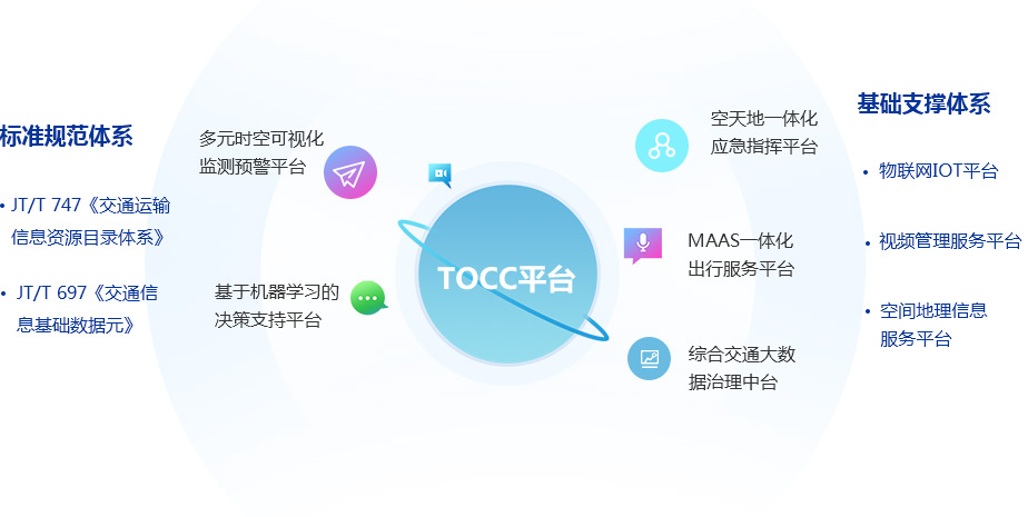 TOCC(交通运行监测与指挥调度解决方案),以多源异构融合的时空大数据为基础,以解决监测应急痛点、行业治理难点、政府决策重点、公众服务热点为导向,以“交通数据一门进出、运行态势一图掌握、监测应急一体联动、数据业务一线贯通”为目标,有效提升交通运输行业现代化治理能力,持续赋能 “综合、智慧、绿色、平安”交通发展。