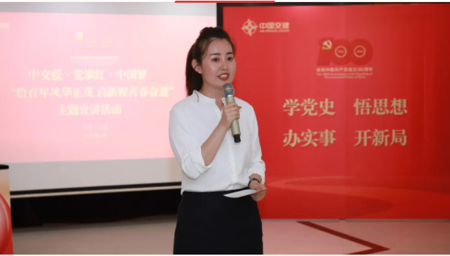 第一党支部书记王楹以《练就干事创业真本领 以奋斗精神铸就青春底色》为题,鼓励青年员工从百年党史中汲取奋进的力量,发挥主人翁精神,为公司发展出谋划策,充分展示新时代青年风采,体现自我价值,实现自身理想。
