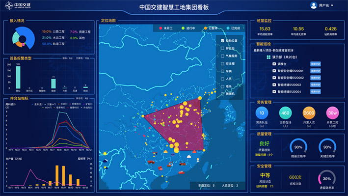 智慧工地平台以穿透管理为目标,融合北斗、物联网、BIM技术,集成现场IOT智能设备,实现人员、设备、机械、物料、质量、安全、环保、监控各要素的全面智能管控,打造“开放、互联、共享、协同”的建筑施工管理信息化新生态。目前已在多个集团直属项目,二级单位重点项目进行了应用落地。