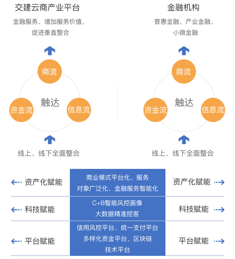 依托中交产业背景,在中小企业和银行之间起到连接作用,为中小企业提供商业模式平台化、金融供给多元化、业务场景化的金融产品和服务,为传统金融机构提供可信任的信息和优质资产。